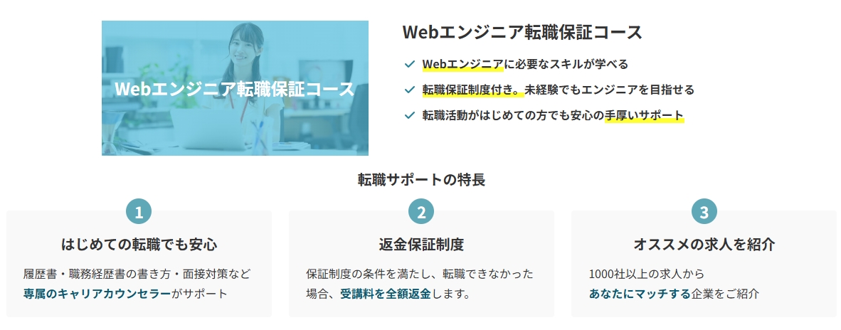 専用コースでは転職成功を保証。万が一転職できなければ受講料を一部返金という安心の仕組みもあります。