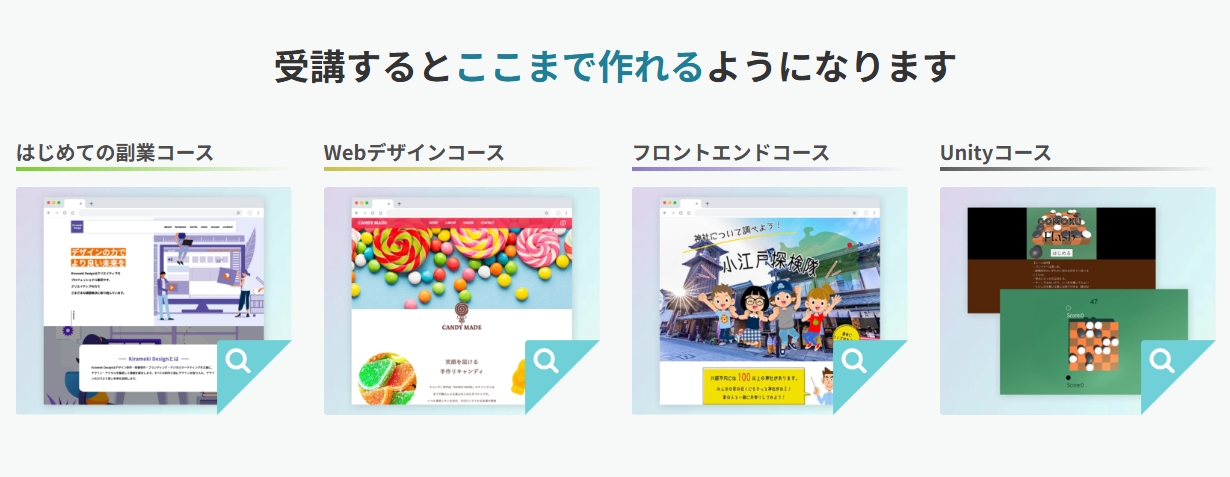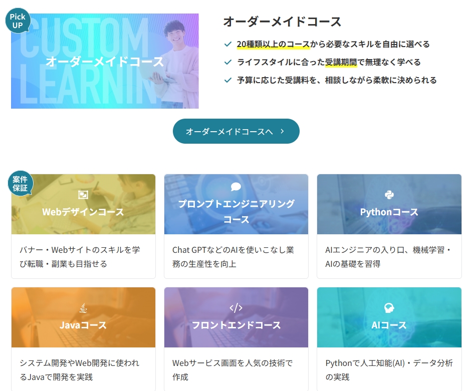 HTML/CSSだけでなく、JavaScript、PHP、Python、Rubyなど、転職市場で評価されるスキルが学べるかをチェック。
